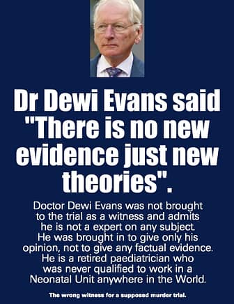 (i). I am confused about what exactly Dr. Evans’ role was at trial because he is actually on record denying that he was an expert witness. During cross-examination concerning the death of Baby A, he stated: “I call myself an independent medical witness, not an expert”. This is very confusing because Dr. Evans was not being called on by the prosecution to give evidence as a witness of fact. This was the trial of a criminal case against Lucy Letby, not an inquiry into the police investigation itself. Just to be clear, medical doctors often are called as witnesses of fact in all sorts of legal cases, including criminal trials, where they can give factual evidence or some interpretation of evidence relevant to the trial. This is common where someone concerned with the case is or was a patient of the doctor. In this capacity, the doctor is acting as a ‘professional witness’, which is a type of witness of fact. Is this what Dr. Evans means, so that he was a professional witness on behalf of the police? The problem is that Dr. Evans did not treat any of the patients (the babies), therefore he was not in a position to provide first-hand evidence as would be expected from a witness of fact.