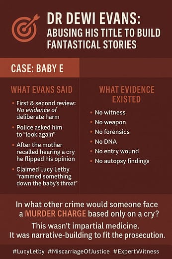 (ii). The claim to be ‘independent’ is not supported by the facts, especially as viewed with the benefit of hindsight, having seen Dr. Evans’ disposition from right after the first trial. Dr. Evans knows that he was embedded in the police investigation and the police depended on him for their detective conclusions. Some of this is not in itself unusual. It has long been the case that experts for the prosecution will have been involved in liaison and co-operation with police officers often from an early stage. But his evidence was pivotal to the whole case: without him, there is nothing. In a real sense, he was the prosecutor and he knows that his work at the investigative stage was not blind reviewed. He willingly agreed to be called as an expert witness, thus advising the court, yet some of these cases rested on his opinions alone. Then, after the convictions, he decided to act as a partisan defender of the prosecution in the media and even suggested that Lucy Letby was responsible for more deaths that should be investigated. These are not the actions of an independent, sceptical, measured, rational expert to the court, but of a partisan person. His recent media statements give the impression, fairly or not, of someone who is still partisan and trying to make the evidence fit a conclusion.